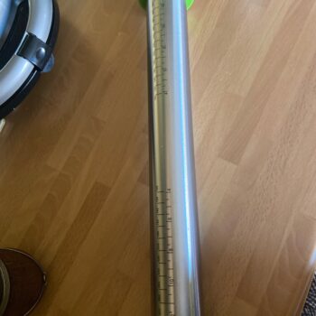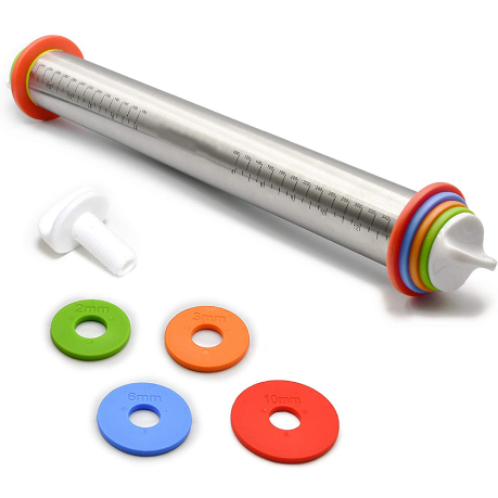 I’m going to go ahead and give it 5 stars even though I haven’t used it yet. The reason for the 5 stars: – The rings are made of substantial, hard plastic. I was afraid they would be flimsy. They are not. – Other comparable products have 3 rings, this has 4. The 4th lets you make pizza dough (sizes are 1/16″, 1/8″, 1/4″, & 3/8″). – You can’t fill it with water (like another product does) but you can put in refrigerator which will make working with dough better. The stainless steel should hold the cold quite well. – I mostly got it because I make cookies for the grandkids and getting even dough thickness makes baking more consistent (less burned cookies). I think it will be great for that. – Very substantial roller. I expect you can exert substantial pressure on dough when rolling (like when dough may still be cold and a little less pliable than you expected)