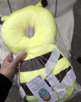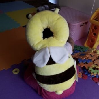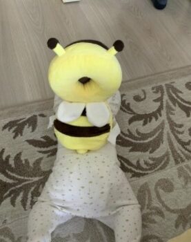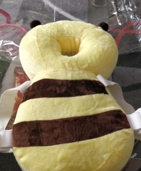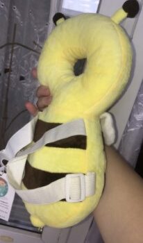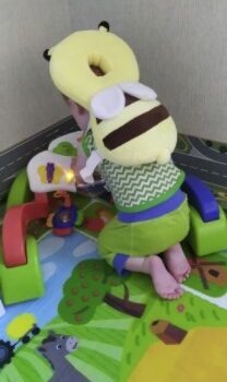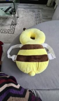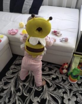 This little bee backpack has literally been a life saver. My 10 month old has been wearing it consistently for the past month and a half and it has saved him from smacking the back of his head on our tile floors too many times to count. He was a little interested in trying to pull it off when we first put it on, but now he wears it all the time and doesn’t seem to even notice it is there. Such a simple, cheap, and effective solution for a common baby issue.