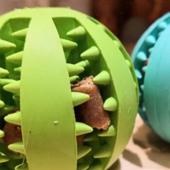 I'm always looking for toys to keep my food-motivated dog occupied, and this one is a winner! I can stuff pizza crust pieces in the spikey sides of the ball, and I've found that small greenies style bones can be stuffed into the middle. She has gotten pretty quick at pulling everything out, but putting a greenies bone in the middle still takes her some time.