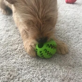 Amazing teether! My dog went crazy for the ball filled with little treats, and finally my shoes are safe.