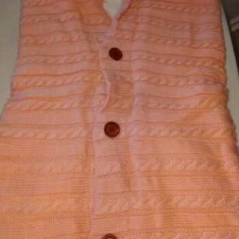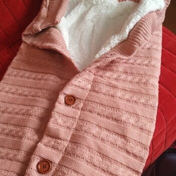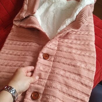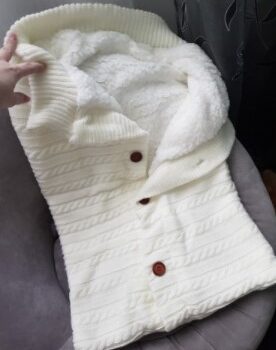 I was very impressed with the quality and style It is made of a soft high-quality knitting wool, fleece lined, which made it so soft and cuddly. It easily can keep a baby comfortable and warm. I love the cardigan sweater look with the buttons, and the full coverage sleeping swaddle blanket. It is for babies from 0 to 12 months, and can be used in all but the warmest seasons. I think this is such a nice good quality swaddle blanket and easily give it a 5-stars rating.