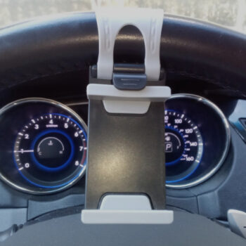 Recently acquired this steering wheel mount and utilized it for an impromptu Zoom call from my car. The strap securely encircles the wheel, and even when positioned at the top, it comfortably accommodated the charging phone at eye level. Throughout an hour-long call, I experienced minimal movement while using the touch screen, making it ideal for my needs. Its simplicity, small size, and affordability make it a perfect tool for my purposes.