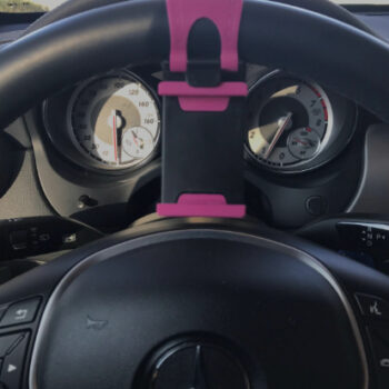 This marks my second acquisition of a phone holder of this style, with the first succumbing to damage caused by my energetic grandson after several years of use. This device effortlessly affixes to my steering wheel, providing a convenient hands-free solution for keeping my phone in sight while navigating the extensive roads of my county. It ensures my Waze directions and alerts remain prominently displayed, addressing concerns like traffic congestion or upcoming accidents. Although snacking while driving is ill-advised, I appreciate the ability to securely store my phone in the holder while I pull over safely to check for nearby snack options. Moreover, I find reassurance in the fact that my phone remains securely in place. Given its minimal footprint on my steering wheel, I'm fully satisfied with its performance and would readily purchase another if needed.