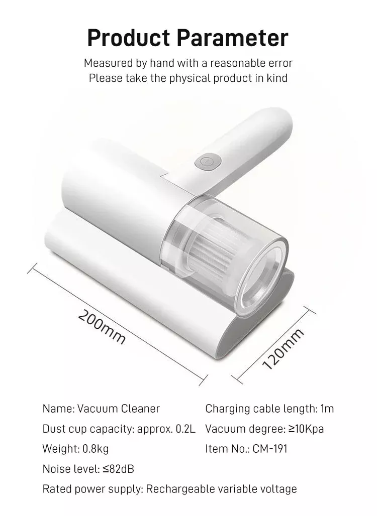 Product Name: High-Frequency Dust and Mite Removal Instrument Vacuum Degree: ≥10Kpa Dust Cup Capacity: 0.2L Weight: 0.8kg Noise Level: ≤80dB Charging Mode: USB